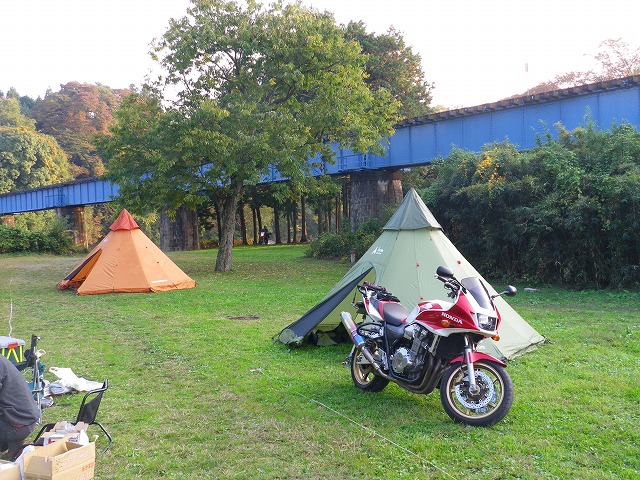 今日は天気がいいのに予定がありません。明日の日曜は仕事の都合で厚木までいかなければならないのでキャンプにもいけません。と、昼ごろY野さんからキャンプのお誘いのメールが。せっかくだから日帰りだけでもと返信すると「それじゃー今回はやめようか」との返事です。せっかくその気になっていたので一人でも決行することにしテーブルと椅子を持って出発。途中スーパービバホームで薪を仕入れ、携帯を見ると「それじゃ2時半にポートタワーで」とメールがはいていました。ちょっと強引に引きずり出したようで申し訳なく思ったのですが、いやだったらメールをよこすはず無いので気にせず集合場所へバイクを進めます。