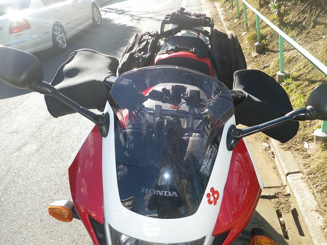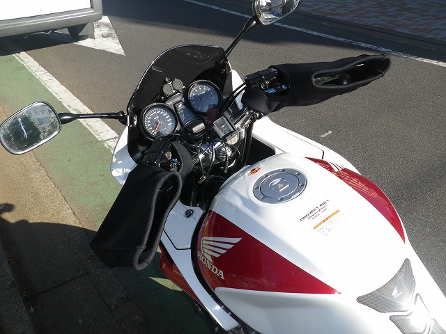 少しかっこ悪いですがとっても暖かいですよ~。グリップヒーターをつけると軍手でも寒くないです。