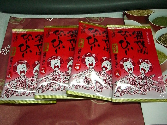 以前、娘が京都のお土産に「舞妓はんひーひー」という唐辛子を買ってきました。使ってみたら、ものすごく辛い。「鷹の爪」の一味唐辛子と比べても圧倒的に辛い。少し使っただけで十分間に合うのでしばらく使うことが出来ましたが、とうとう無くなってしまいました。東京でもどこかで売っているだろうと探してみましたが、結局見つからず、あきらめていました。最近インターネットで見つけました。「おちゃのこさいさい」ブランドで京都東山の店が楽天で販売していました。早速注文して今日届きました。すごく辛いです。日本製のハバネロを細かく粉にした辛子だそうです。辛いもの好きな人は一度試してみたらいいと思います。