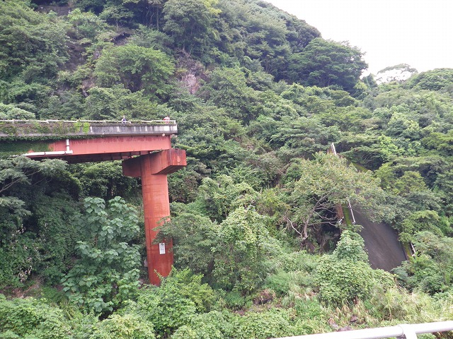写真を良く見てください。道路の先っちょに会長とワタルさんがいます。怖いので私はそこには行きたくありません。その右側には崩落した道路が横になっています。すごい風景です。