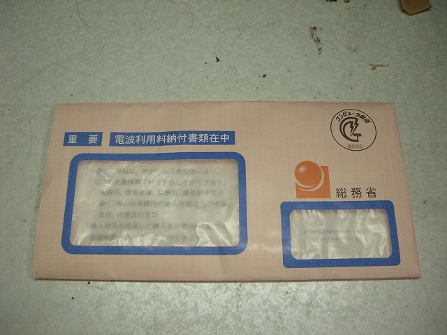 今日、会社から帰ると見慣れないところから封筒が届いていました。「総務省」?あまり縁が無いところです。とりあえず封を切ると中から振込用紙が出てきました。振り込み額300円。中途半端でまったく身に覚えがありません。封筒をよく見たら。「電波利用料納付書類在中」の文字があります。