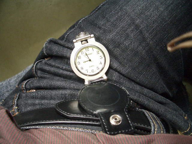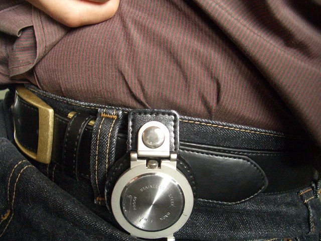 写真は最近見つけたベルト時計。腰につけて開くと文字盤が正対して普通に見ることが出来る。昔からあったようで、知っている人は知っているようだが、懐中時計と違って機動力抜群だ。これなら袖の窮屈さを考えなくてもよさそうだ。しかし、時計は時計、マイペースでやりたいと思うこのごろです。