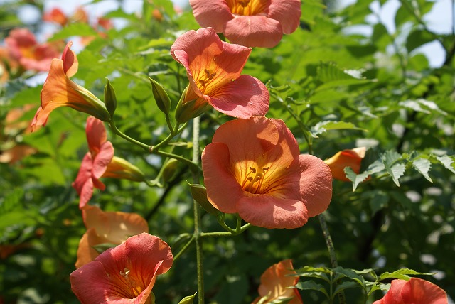 この時分東京では「アジサイ」の最盛期は過ぎ、ここ向丘百花園では「ノウゼンカズラ」の花が目立ちました。今が最盛期のようにオレンジ色の大きな花でさきほこっていました。此花はつる性のために生垣や大きな樹に巻きつくように咲いています。