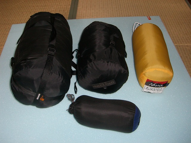 晩秋や冬は中央のコールマンに左側の羊毛シェラフを重ねて耐えていましたから違いはとても大きいです。因みに左のやつは昔買った無名メーカーの3シーズンで Φ230×450mm 2000g以上(計量できなかった)です。でかい!
