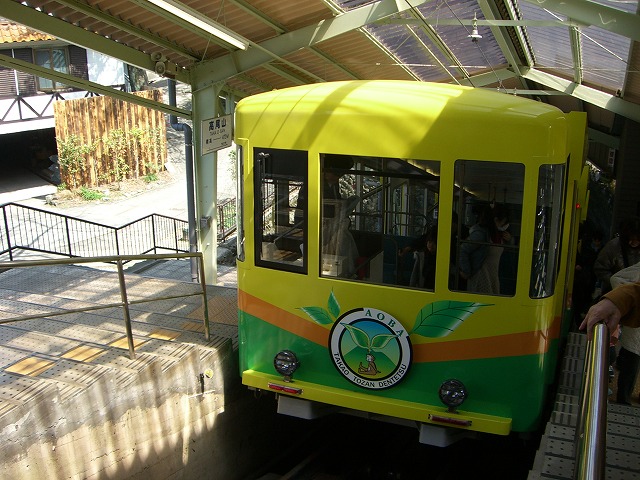 「高尾山の記録」の第一回目で、以前から乗ってみたかったケーブルカーを利用することした。料金470円。15分ほど待って乗車した。登り始めると前に傾いていた座席が勾配とともに水平になり終いには後ろに傾いてくる。数分で頂上駅に到着。非常に楽チンであった。