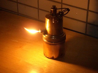 小型の「カーバイトランプ」。昔おでんや屋台で使っていた大型で二股のものを思い出します。