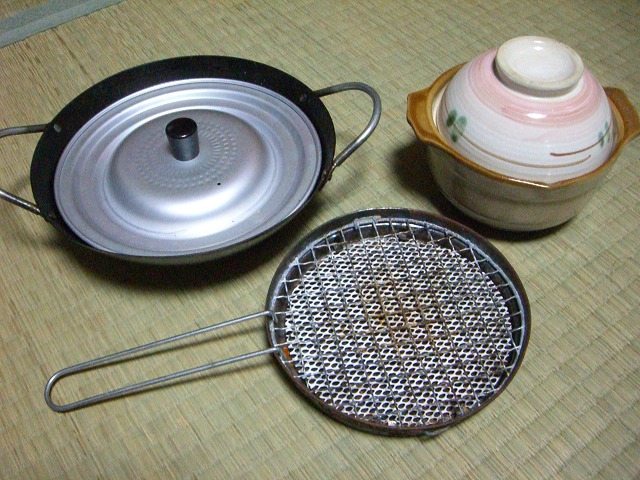 「ちび中華なべ」「ちび土鍋」「ちび網焼き」、すべて100円ショップでそろえました。だから一度使用しただけで処分しても全然大丈夫です。とはいえ、このセットは捨てることなく何回も使っています(笑)。