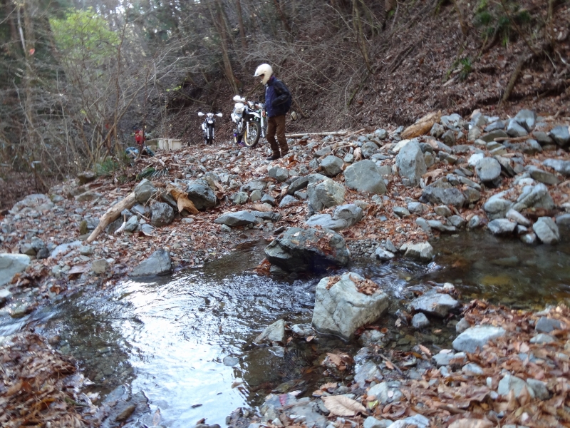 今回の林道は期待していたよりかなり難しい林道でした。川渡り有り、倒木有り、瓦礫有り、盛りだくさんでした。そんな林道を先頭のSAWAさんはサクサク走ってゆく実力派。すごい!