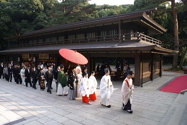 ちょうど敷地真中の「舞殿」で行なっているので観光客や大勢に見られながらの結婚式です。