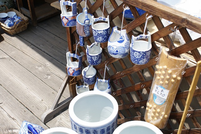 通りで瀬戸物のような飾りを打っている。猫や蛙や色々な動物が置かれている