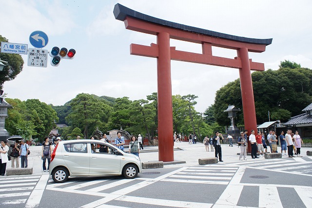 やっと鳥居に到着です。交通量が多いので信号が変わるまで通りの向かえでしばらく待ちます