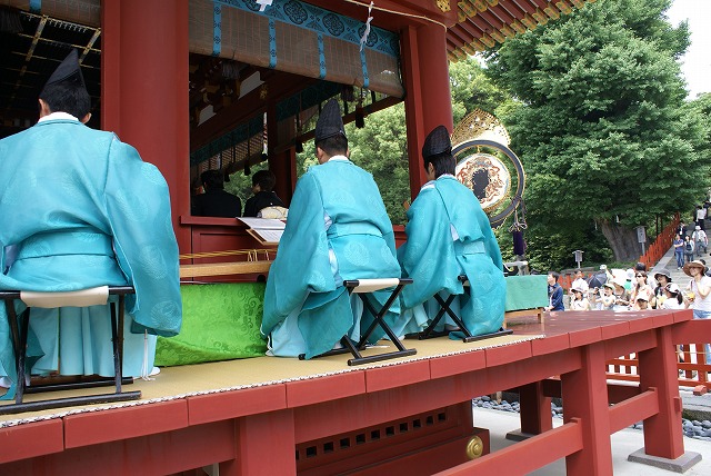 中で巫女さんが舞っています。笛と太鼓と歌いが一段低い位置で奏でています。