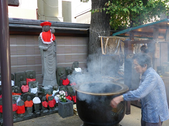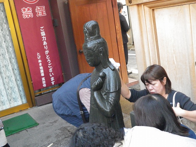 とげぬき地蔵こと高岩寺山門隣にはたくさんのちょうちんがぶる下げられていました。よく見ると地蔵通りに有る商店名がその順番に並べられていました。縁起より商売熱心なようです。とげぬき地蔵の隣にあるお地蔵さんの前で煙をかき回している年寄りが居ました。今よりもっともっと頭が良くなりたいようです。本命の「とげぬき地蔵」の前は大変な人だかりで順番待ちの列が長く伸びていました。初代の「とげぬき地蔵さま」はみんなにたわしでこすられ形が崩れてしまったので今は二代目の美しい地蔵に変えられてしまいました。しかもタワシは禁止。タオルで拭うようになってしまいました。なんか味気ないような気がします。